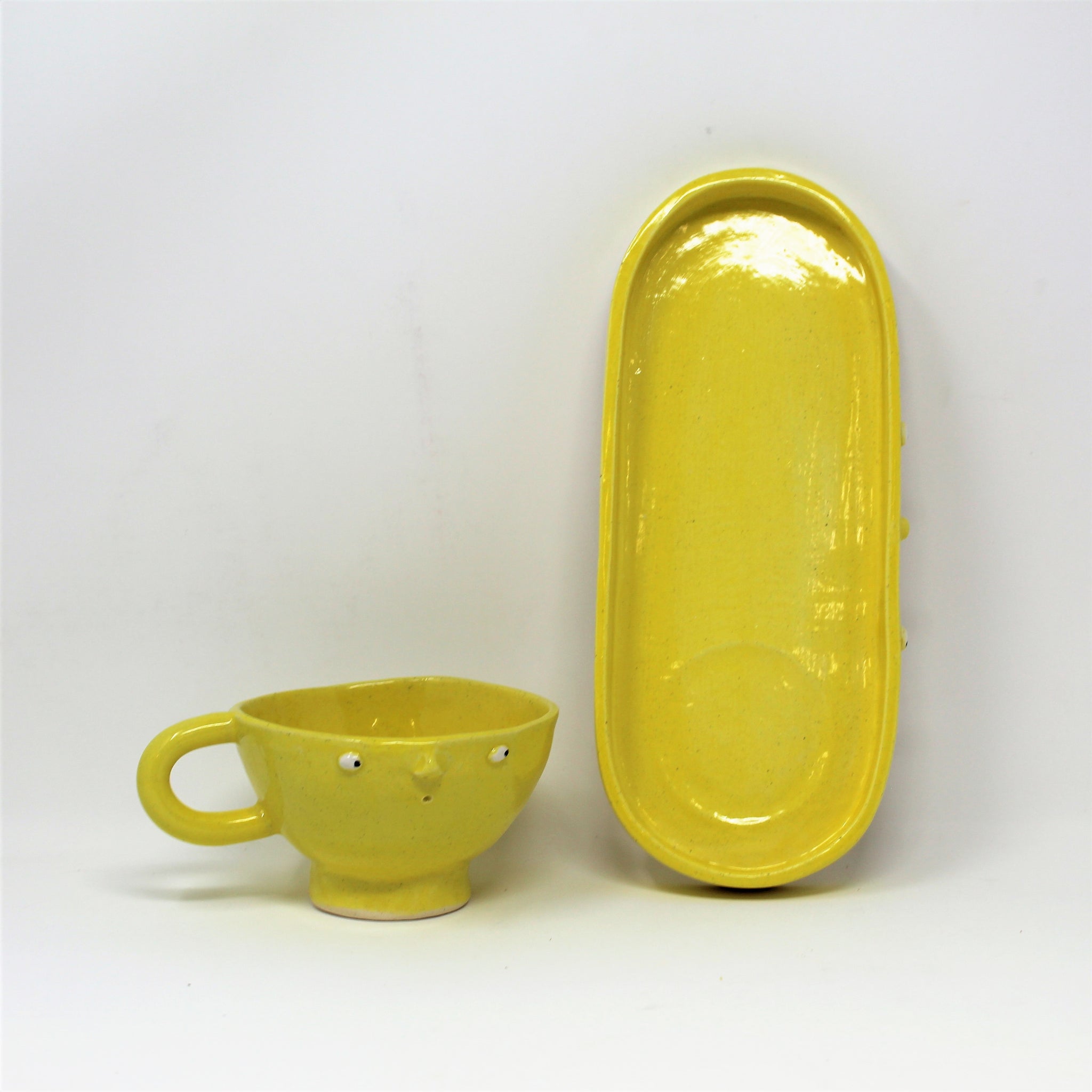 Handbuilt cup and tray made from stoneware clay.
